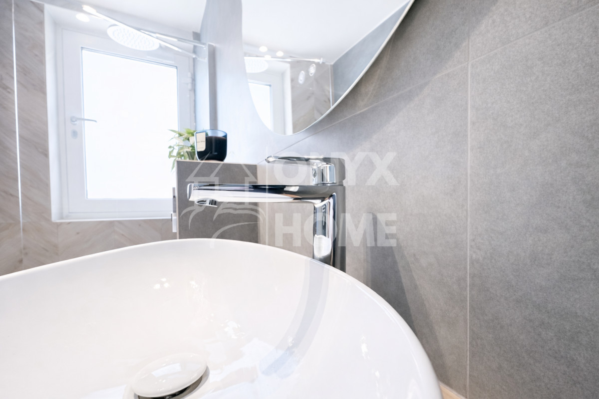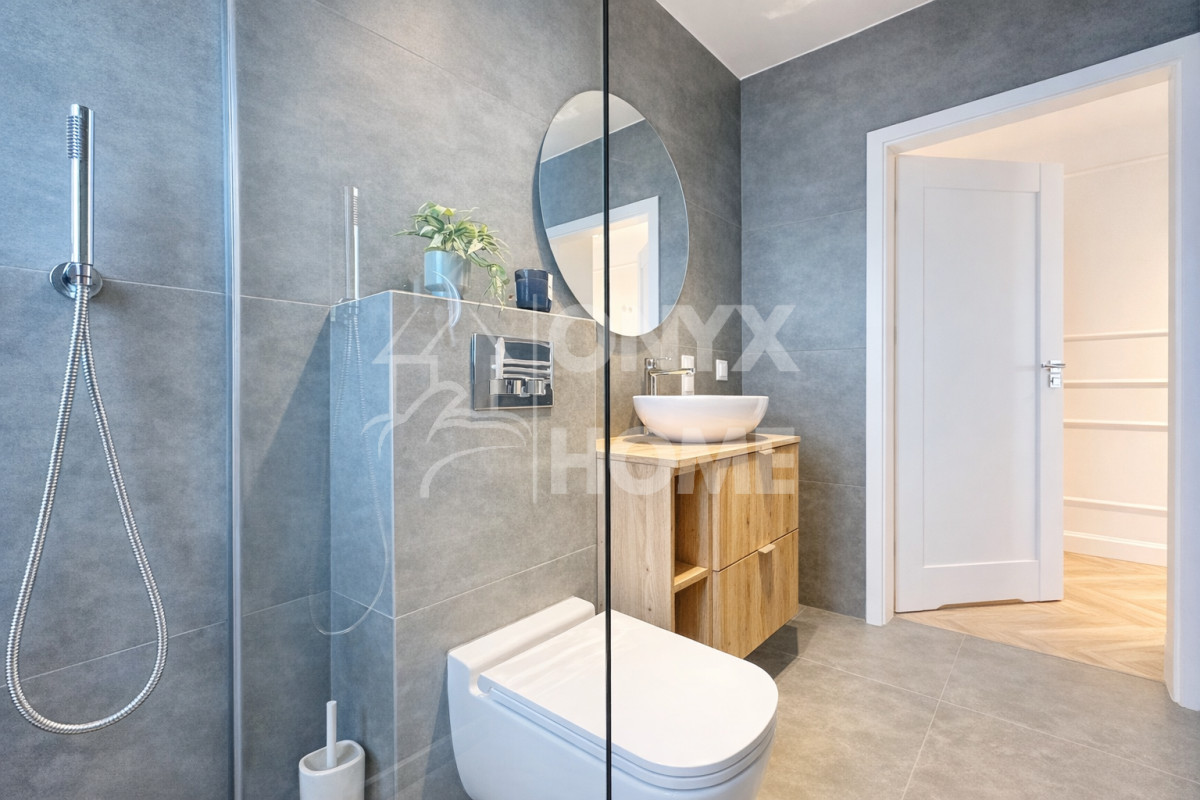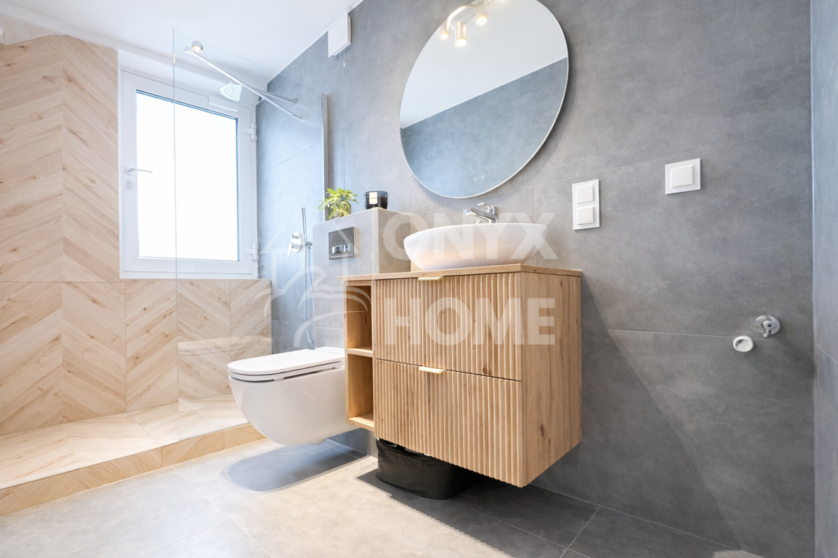 łazienka z oknem, kabiną walk-in, baterią podtynkową, szafką z umywalką, WC.