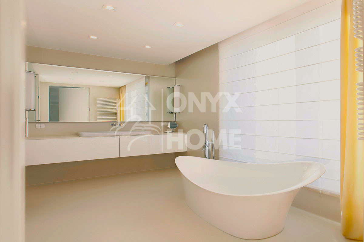 - Luksusową łazienkę z dużymi przeszkleniami, wanną i prysznicem walk-in,