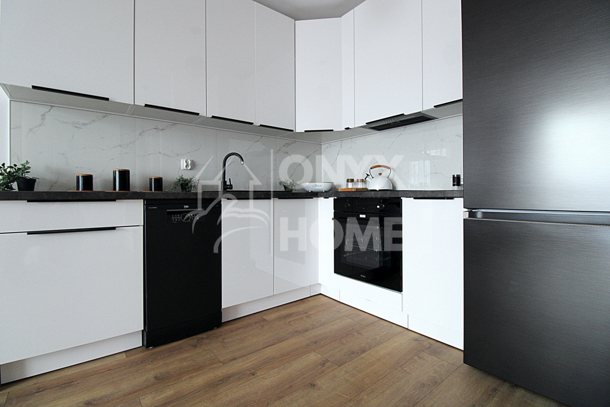 Salon z aneksem kuchennym to serce mieszkania - przestrzeń idealna zarówno do odpoczynku, jak i spotkań z bliskimi. Kuchnia została wykonana na wymiar i wyposażona w wysokiej jakości sprzęt AGD (lodówka, piekarnik, płyta, okap, zmywarka), który objęty jest gwarancją. Zabudowa jest bardzo funkcjonalna, zapewnia dużą ilość miejsca do przechowywania.