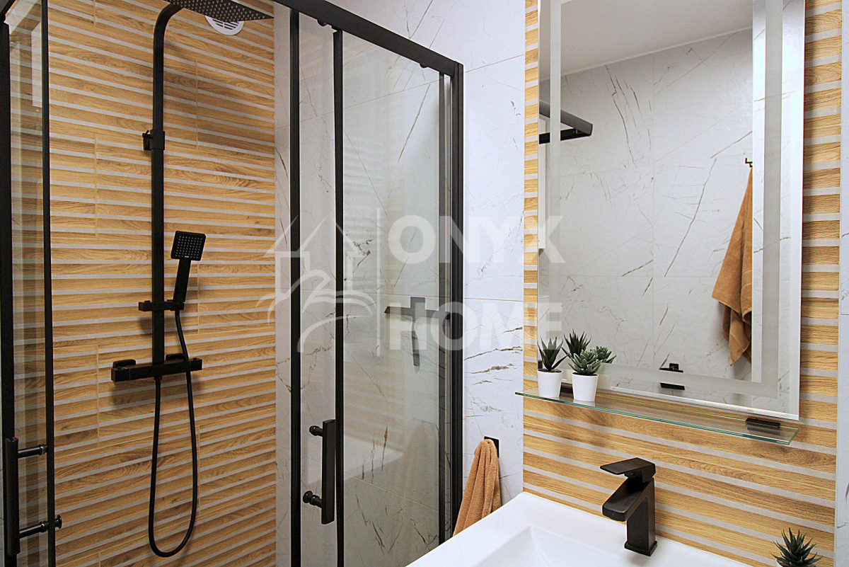Łazienka- wyposażona w nowoczesny prysznic oraz starannie dobraną armaturę, a jej wykończenie nawiązuje do stylistyki całego mieszkania, tworząc spójną, elegancką przestrzeń.