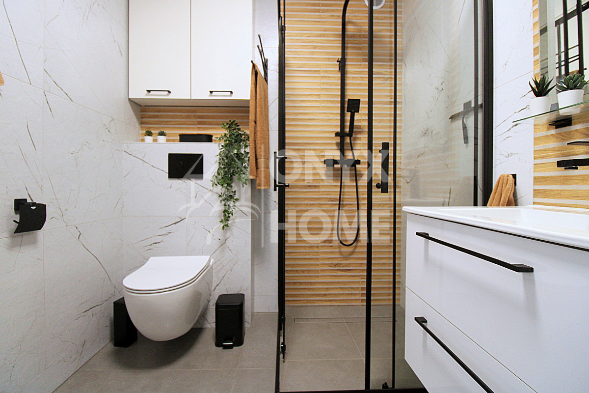 Wnętrze zaprojektowano w nowoczesnym, eleganckim stylu, bazując na ponadczasowej kolorystyce: bieli, beżu oraz czerni. Harmonijne połączenie tych barw sprawia, że przestrzeń jest jasna, przytulna i niezwykle estetyczna. Całość dopełniają modne lamele ścienne, które nadają wnętrzu charakteru i podkreślają jego designerski styl.