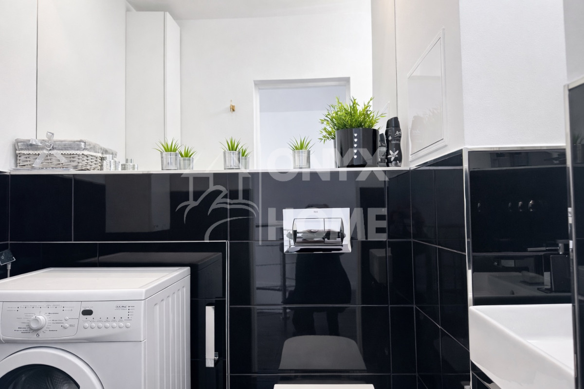 2 łazienki. Pierwsza znajduje się na górze i jest wyposażona w umywalkę, wc, pralkę i panoramiczne lustro,