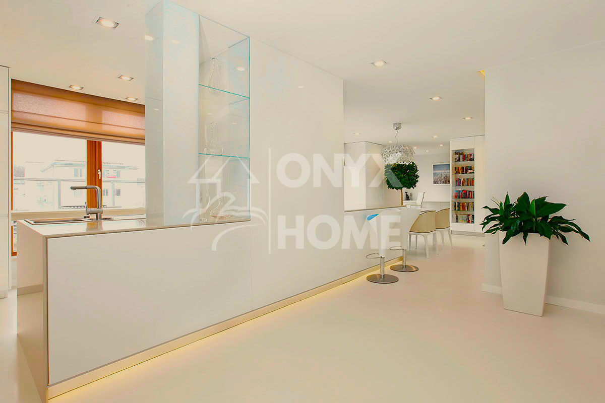 - Przestronny salon z panoramicznymi przeszkleniami i otwartą kuchnią,